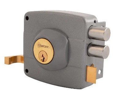 Cerradura sobreponer 110 de color negro con 2 cerrojos cilíndricos, para puertas de 30 a 50 mm de espesor. Cerrojos cilíndricos. Cilindro con lanza ajustable. Picaporte reversible.