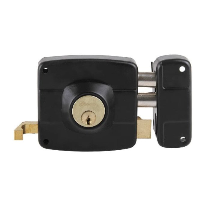 Cerradura sobreponer de color negra para rejas de 30 mm de espesor. Para puertas de 30 a 50 mm de espesor. Cerrojos cilíndricos. Picaporte reversible. Incluye contrafrontal, elementos de fijación y caja metálica para soldar.