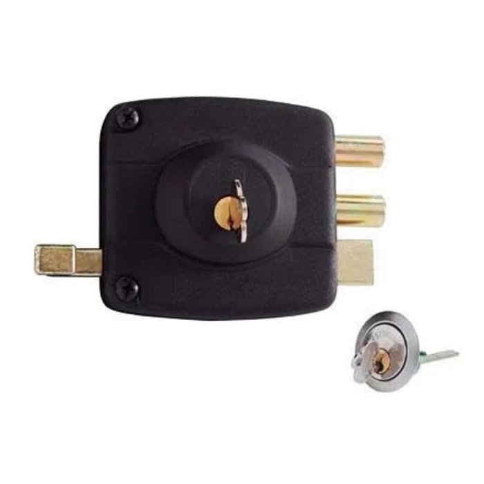 Cerradura sobreponer para puertas de acceso principal y rejas de bodega con espesor regulable de 30 a 45mm. de espesor. Cuenta con cilindro en ambos lados y picaporte reversible, sin caja.