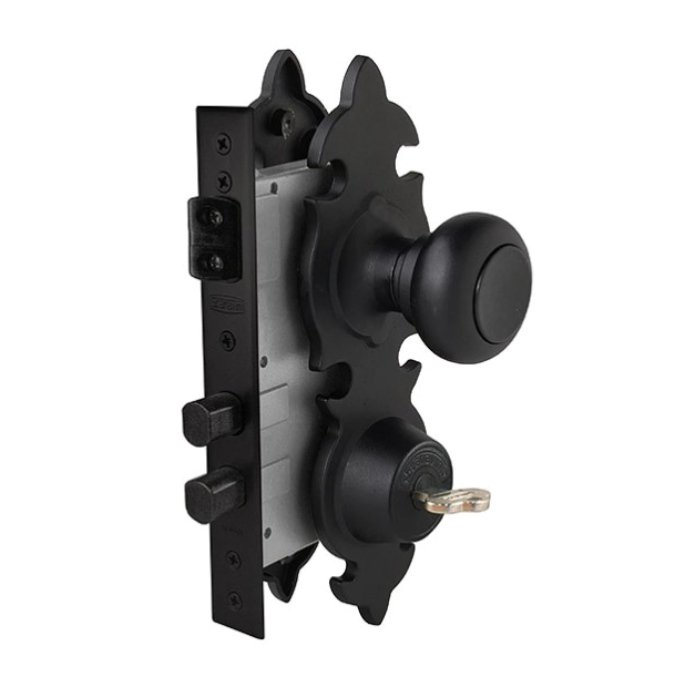 Cerradura acceso principal. Pomo exterior fijo e interior libre, cilindro en ambos lados, Pomo exterior fijo e interior libre, picaporte reversible, cerrojo de dos pitones.