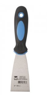 Espátula profesional de mango ergonómico de termocaucho y hoja de acero de carbono flexible, posee un baño de cromo para protegerla de la oxidación.